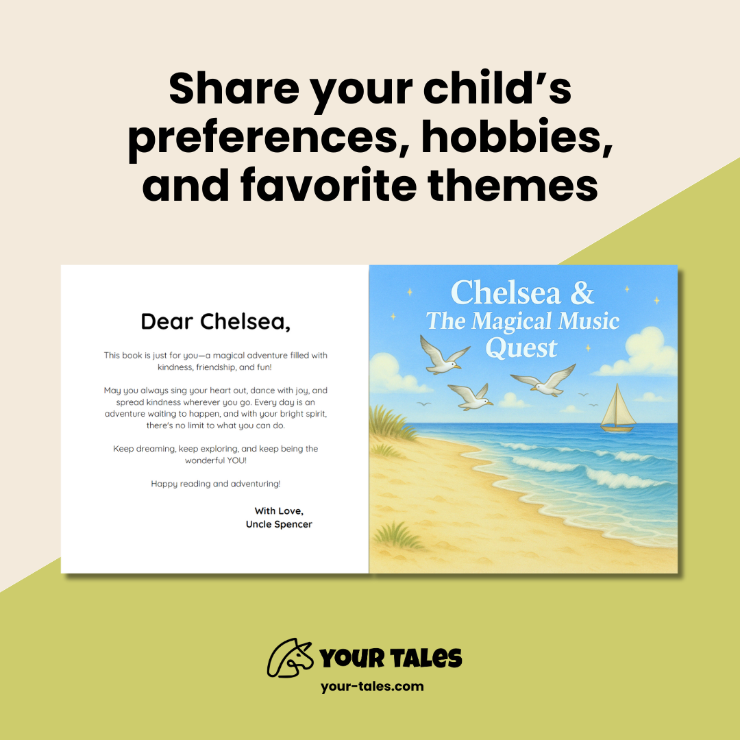 Share your child’s preferences, hobbies, and favorite themes, and we’ll create a one-of-a-kind story that celebrates their imagination and brings their dreams to life!