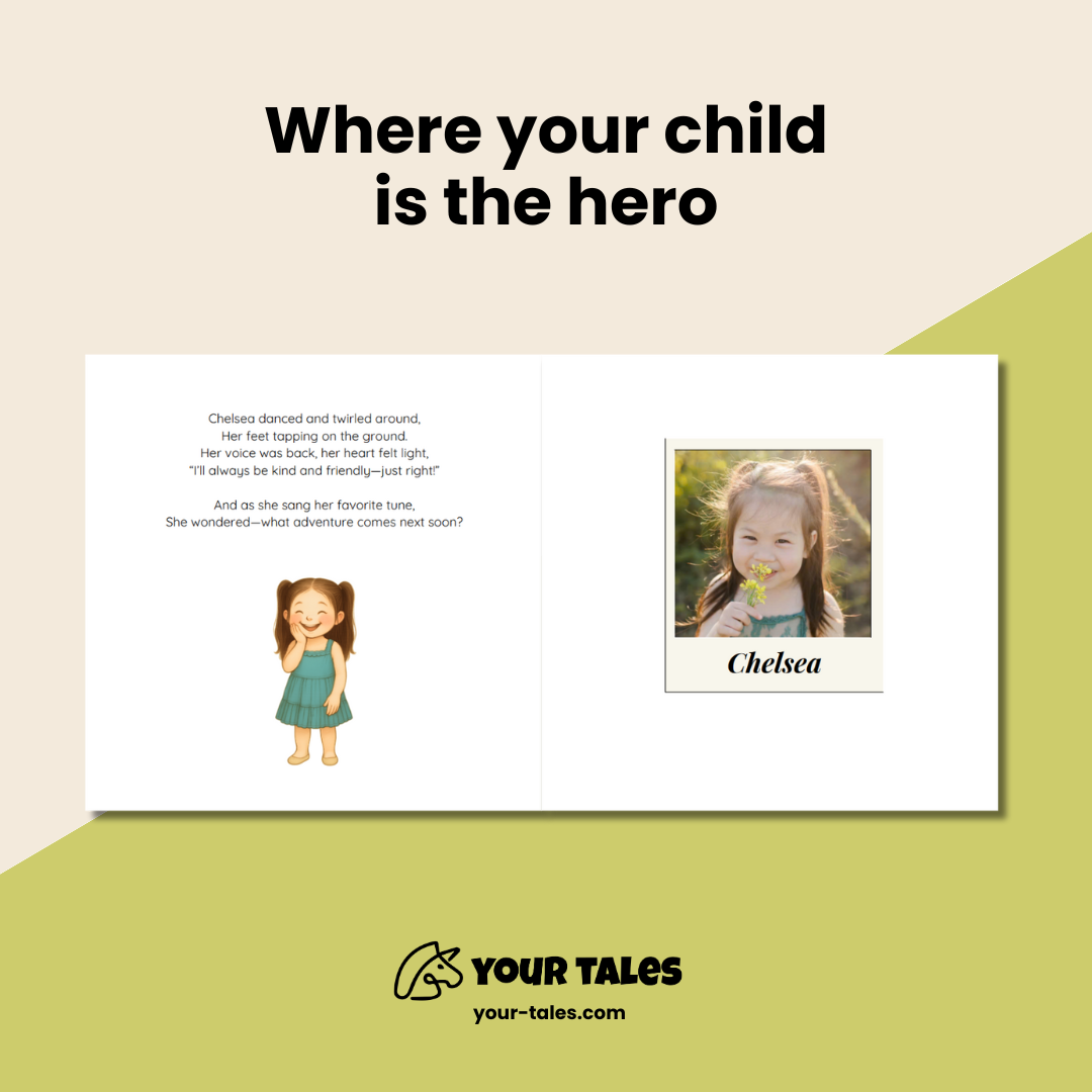 Imagine a magical book where your child is the hero, their favorite things come to life, and every page is uniquely crafted just for them. From the title and storyline to the text, audio and illustrations, every detail is tailored to their unique interests.