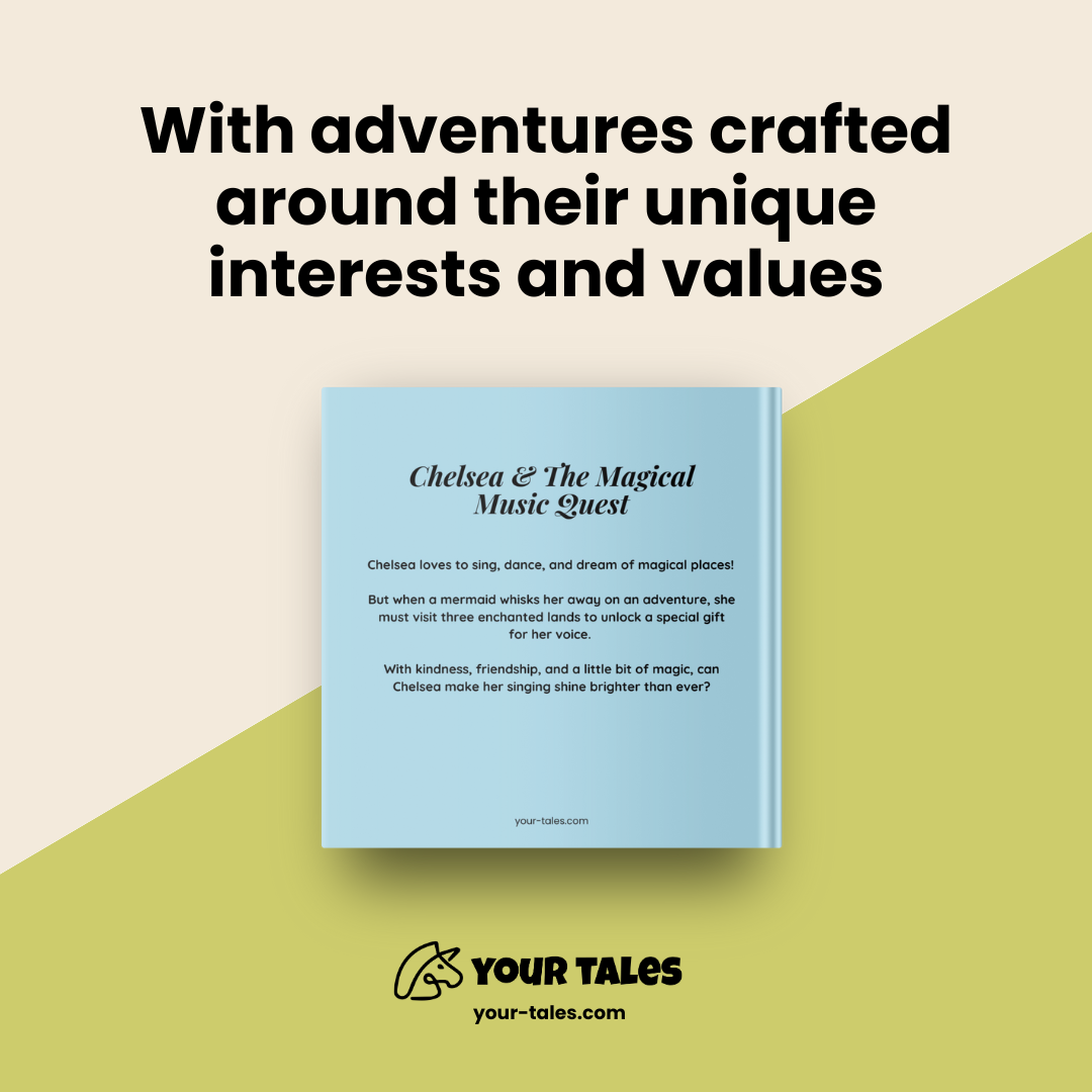 Personalized kids' storybooks (8*8*0.8 inch / 20*20*2 cm hardcover books) that bring your child’s imagination to life, with adventures crafted around their unique interests and values.